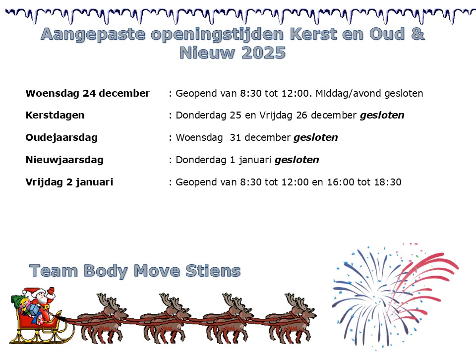 Tijdens de feestdagen hebben we aangepaste openingstijden. Maar er blijft tijd genoeg om lekker te trainen.